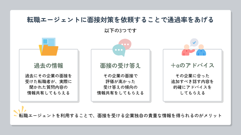 私は転職エージェントを利用して転職活動を行いましたが、面接対策をお願いするだけでなく、通過率を上げるための情報収集にも力を入れていました