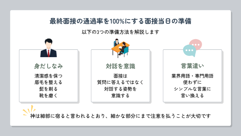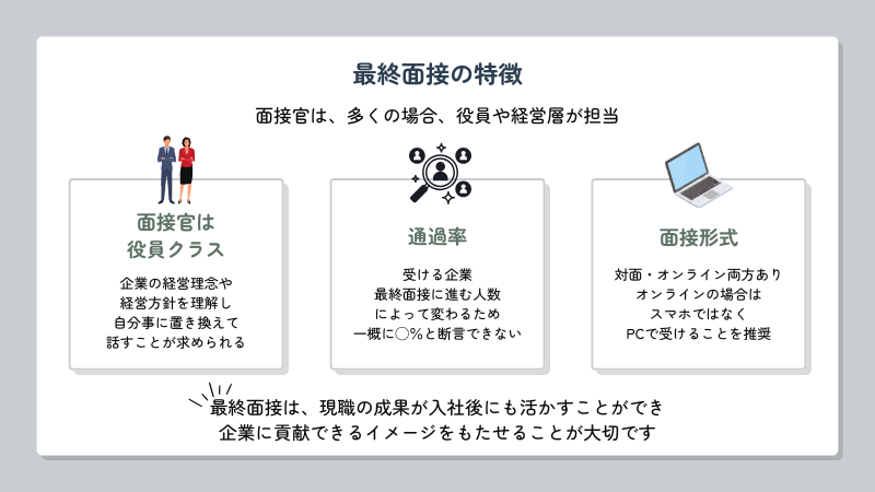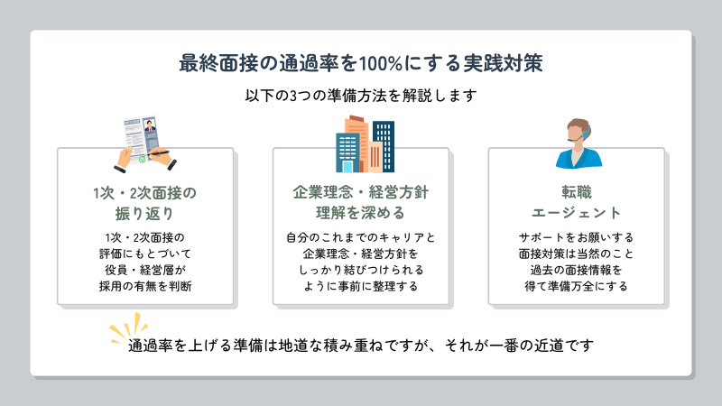 この3つをしっかり抑えるだけで、最終面接の通過率は確実に上がります