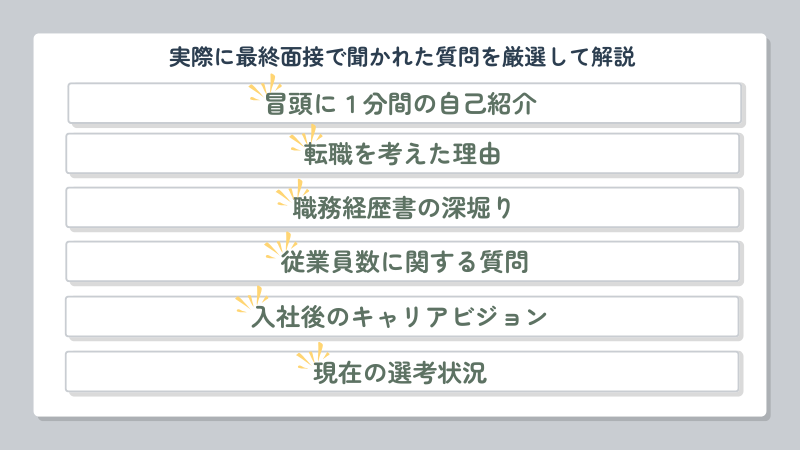 一例ですが、私が最終面接で実際に受けた質問は、以下のようなものでした