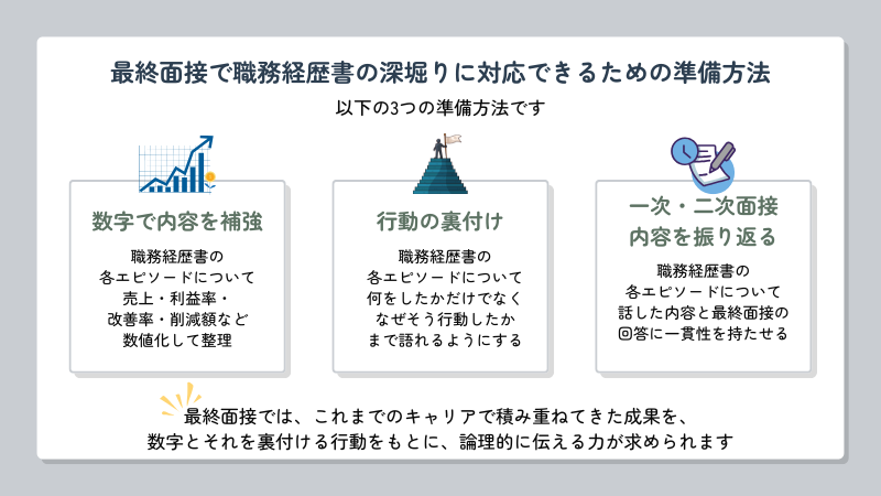 最終面接では、一次・二次面接の評価を踏まえたうえで、職務経歴書の内容を更に深掘りされます