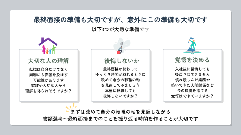 その短い期間で覚悟を決めきれないと感じる方は、最終面接が終わった段階で一度立ち止まり、自分の気持ちや状況を整理して決断の準備を整えることが大切です
