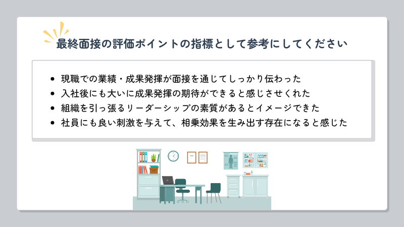 最終面接では、一次面接や二次面接の評価をもとに役員・経営層が実際に面接をして、自社のカルチャーや価値観にマッチする人財かを見定められます