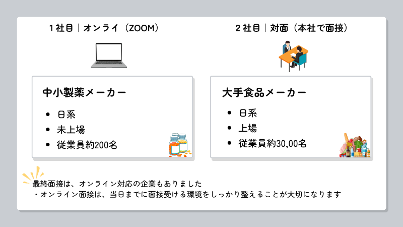 私の場合、最終面接を受けた2社(製薬メーカー・食品メーカー)は次のような形でした