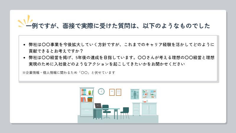 役員・経営層と面接するため、企業の価値観や目指す方向性を理解したうえで、質問に的確に答えなければいけないからです