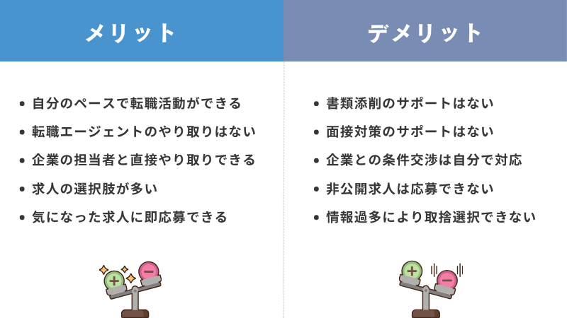以下は、転職サイトのメリット・デメリットをわかりやすく整理した比較表です
