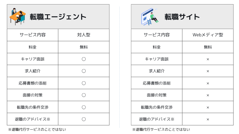 まずは、転職エージェントと転職サイトのサービスの違いについて解説していきます